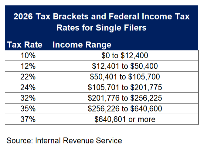 For purposes of this illustration, we assume that Craig doesn’t deduct business or other expenses or make estimated quarterly tax payments. We’re also not going to factor in the income-lowering impact of the standard deduction he’ll take when he completes his 2026 tax return next year.